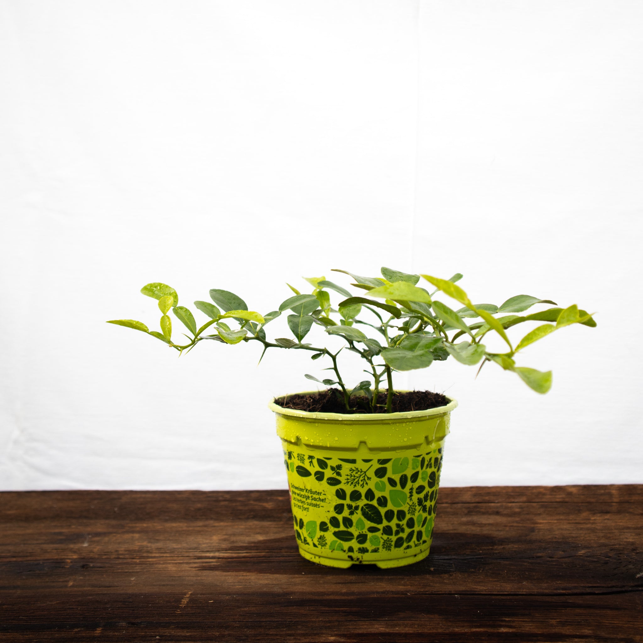 Die Schale der Kaffir-Limette ist im Gegensatz zur normalen Limette sehr runzelig. Als Besonderheit zählen die glänzenden Blätter, die geflügelt sind und daher wie Doppelblätter wirken. Sie sind äußerst aromatisch und in vielen asiatischen Gerichten ein wichtiges Gewürz. Die Früchte selber enthalten sehr wenig Saft und sind sehr kernreich. Daher verwendet man zum Würzen neben den Blättern häufig den Abrieb der Schale, der nach Pfirsich und Zitrone duftet.